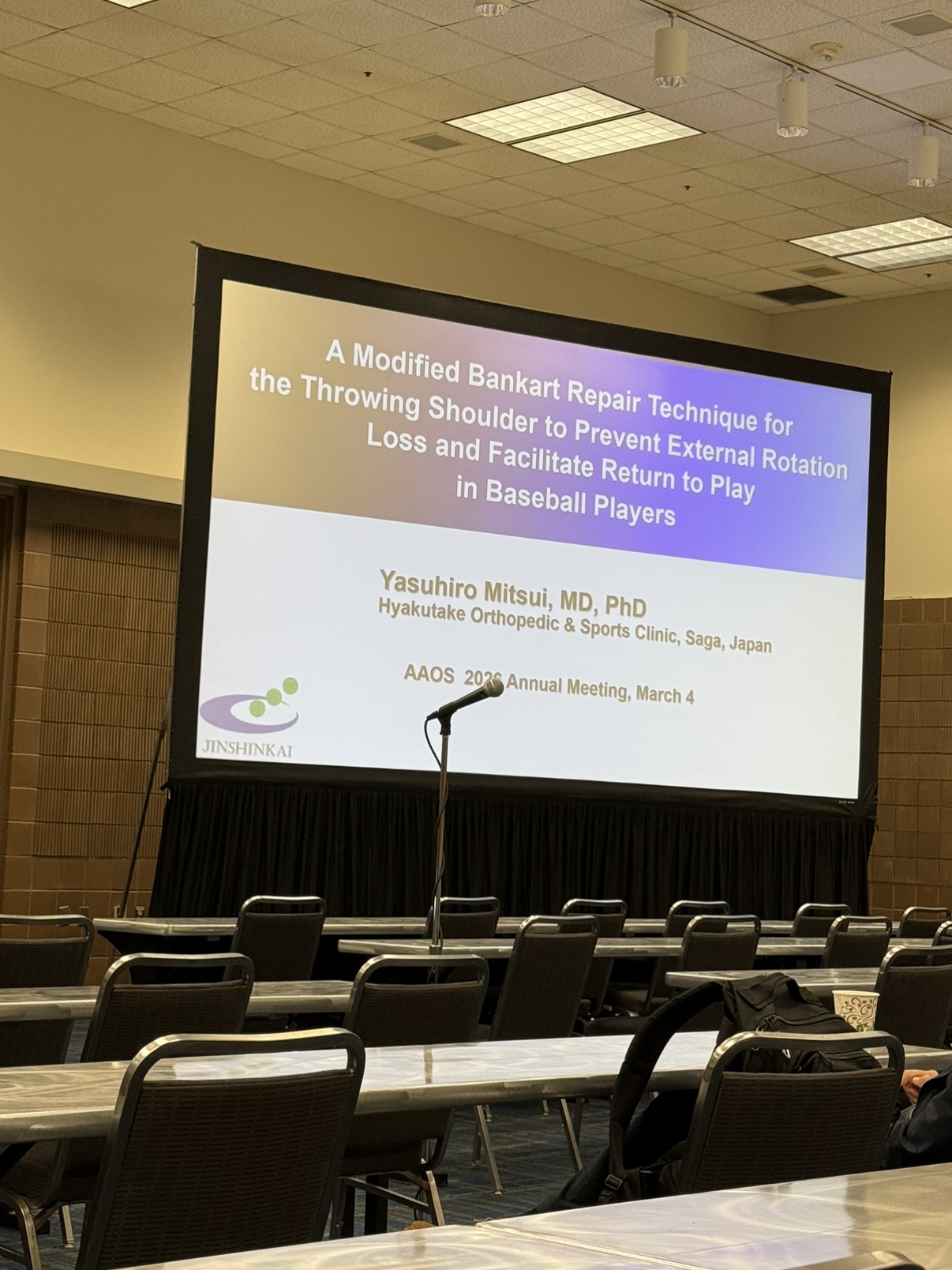 当院からは光井医師が、野球選手の投球側肩脱臼に対する鏡視下バンカート修復術の手術成績とその手技の工夫を発表しました。